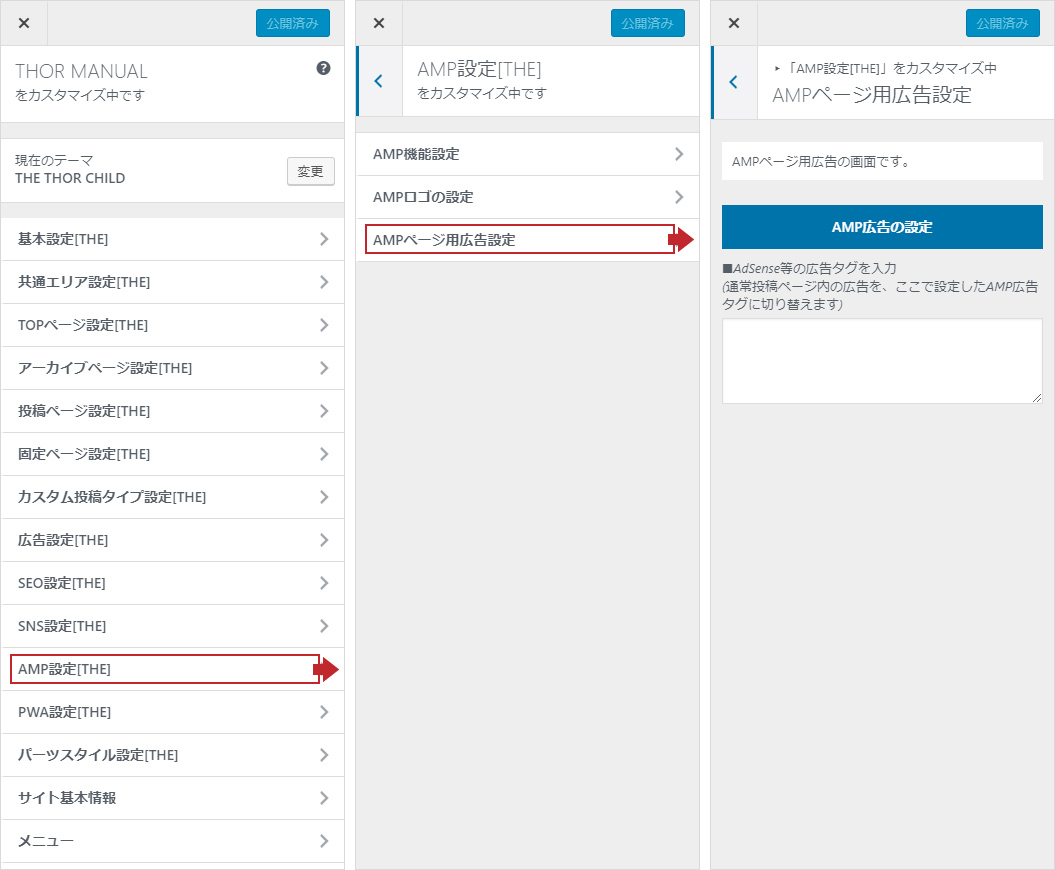 「AMP広告の設定」で表示させたい広告タグを入力し「公開」を押してください。