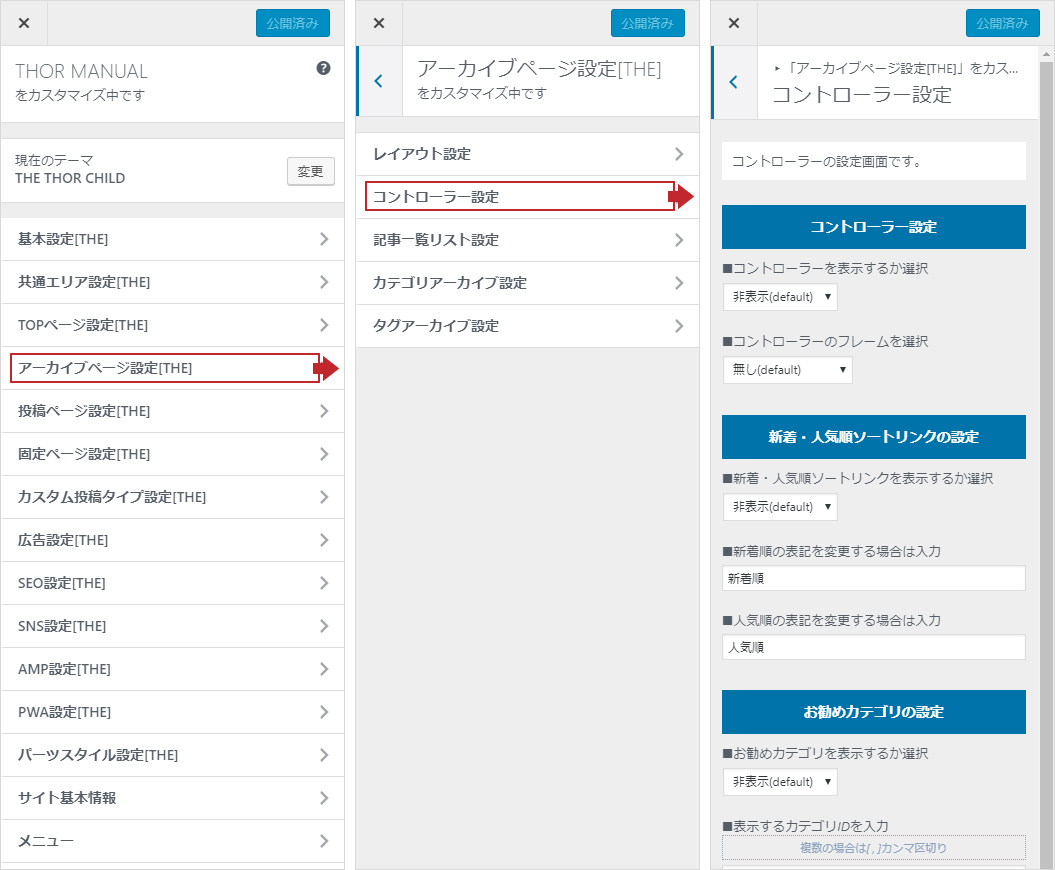 「外観」→「カスタマイズ」→「アーカイブ設定」→「コントローラー設定」へ進みます。