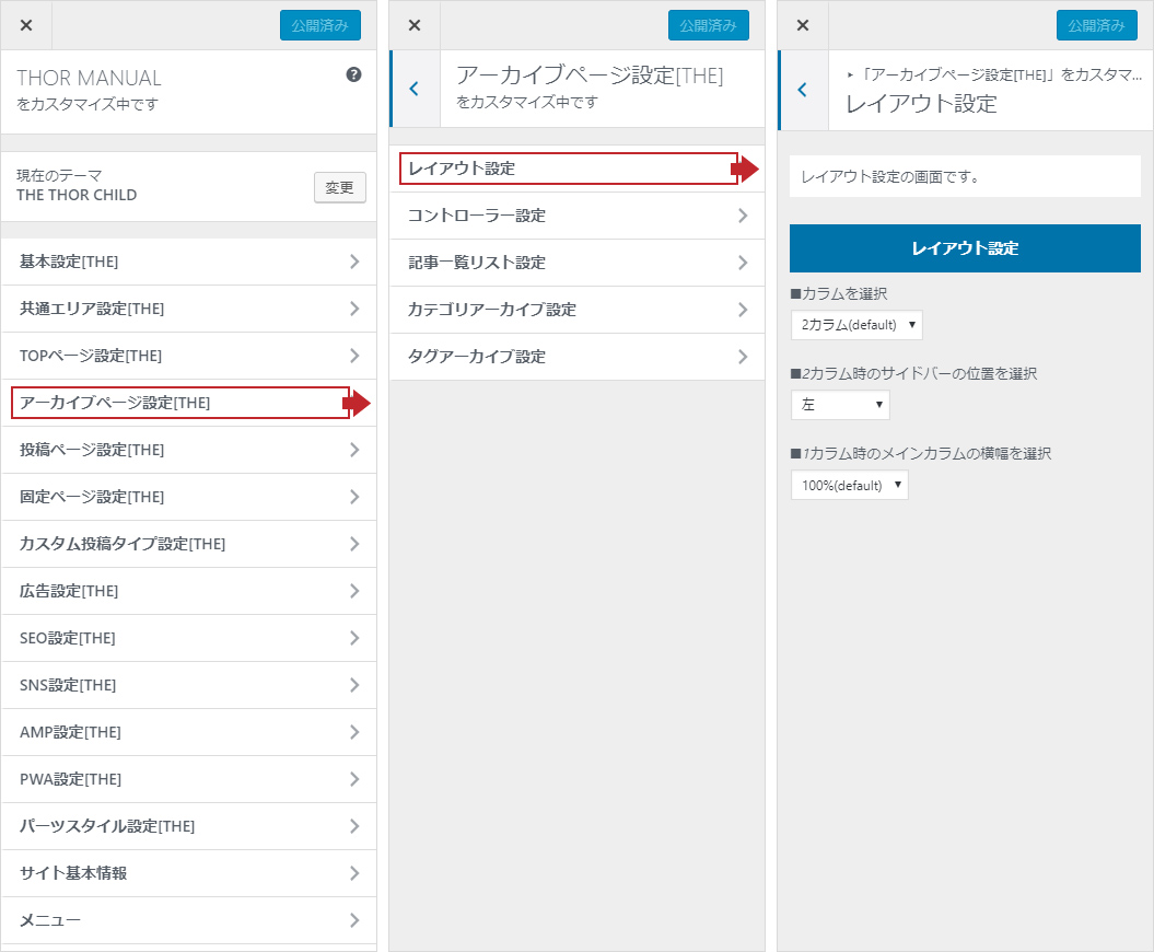 「外観」→「カスタマイズ」→「アーカイブ設定」→「レイアウト設定」へ進みます。