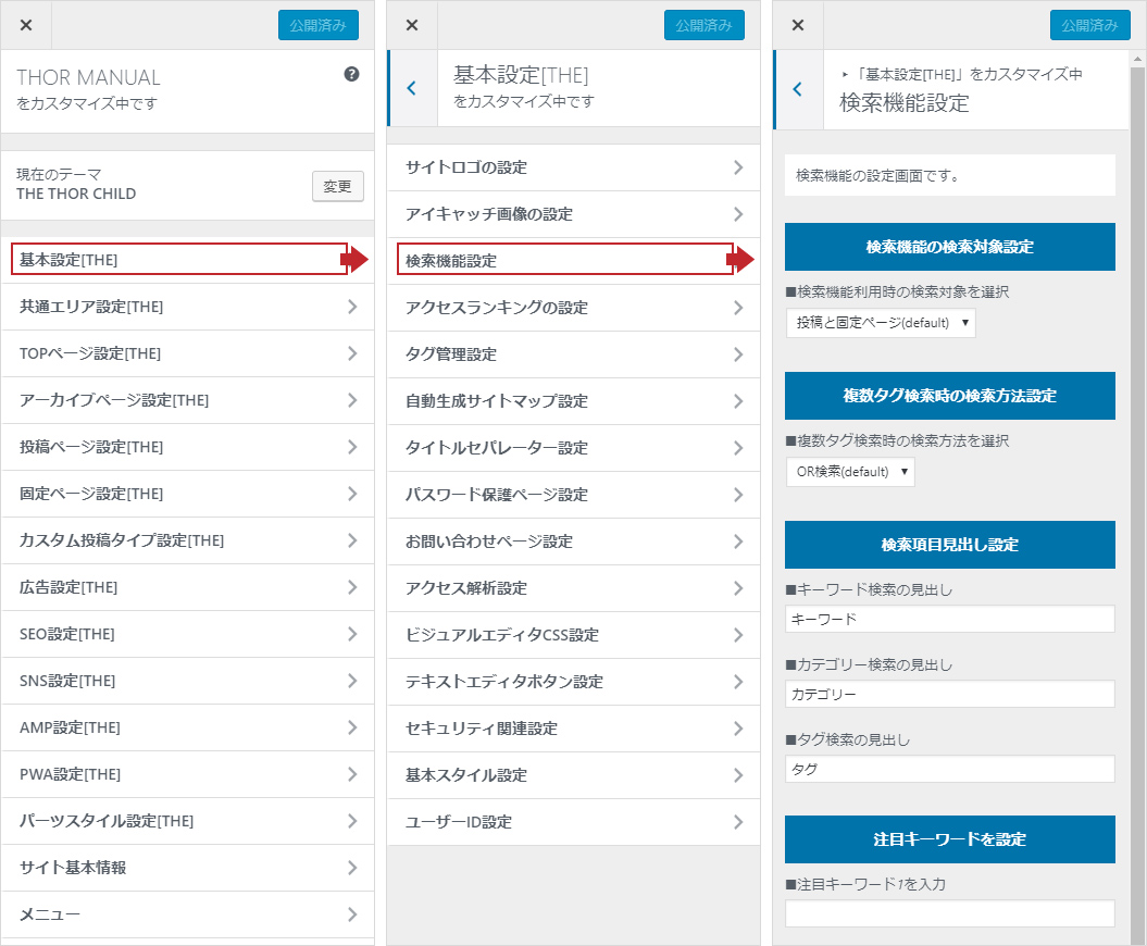 「外観」→「カスタマイズ」→「基本設定」→「検索機能設定」へ進みます。