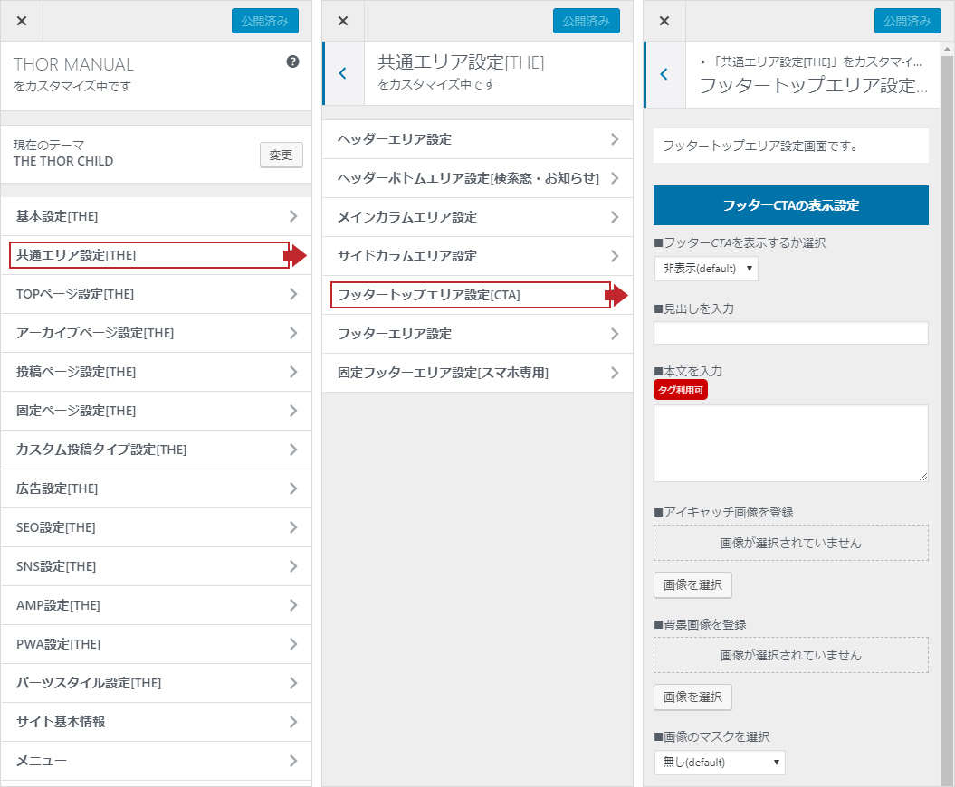 「外観」→「カスタマイズ」→「共通エリア設定」→「フッタートップエリア設定(CTA)」へ進みます。