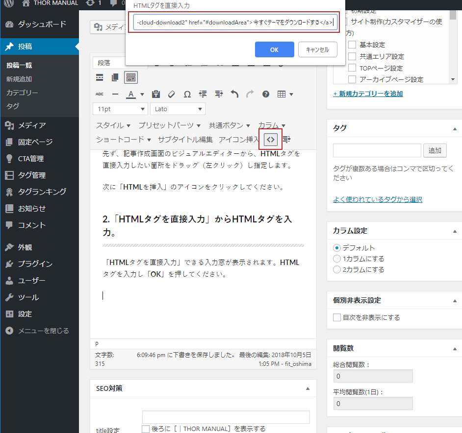 「HTMLタグを直接入力」できる入力窓が表示されます。HTMLタグを入力し「OK」を押してください。