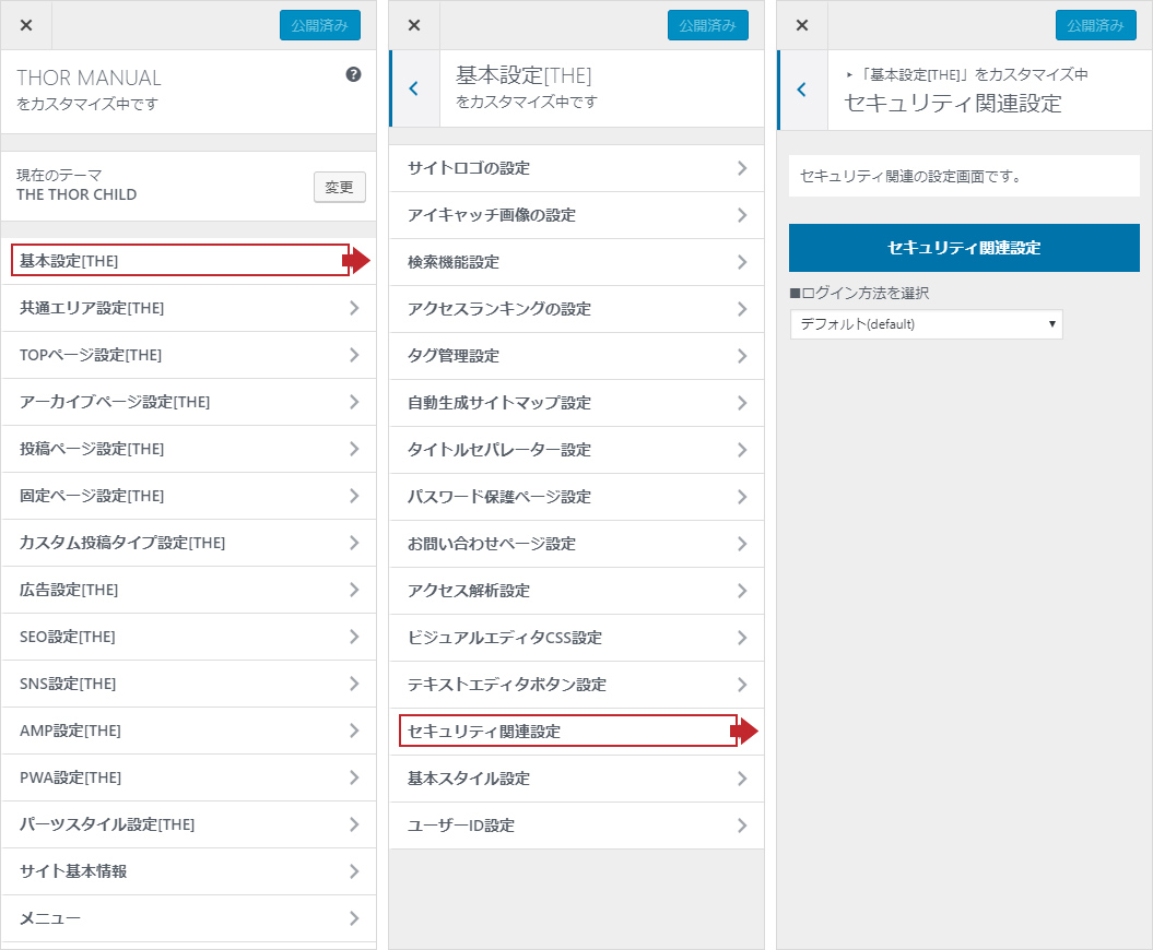 「外観」→「カスタマイズ」→「基本設定」→「セキュリティ関連設定」へ進みます。