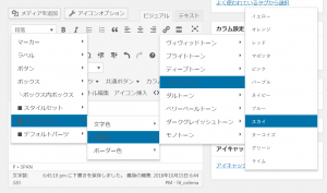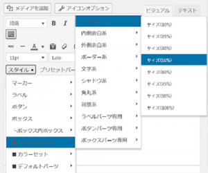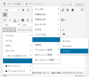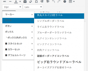 ビジュアルエディタのメニューから「スタイル」→「ラベル」を選択すると、先ほどラベル設定から登録した角丸スカイ1.5倍ラベルが新規に登録されています。角丸スカイ1.5倍ラベルをクリックするだけで記事中に角丸スカイ1.5倍ラベルを設置できます。