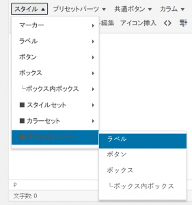 ビジュアルエディタのメニューから「スタイル」→「デフォルトパーツ」→「ラベル」の順に選択します。