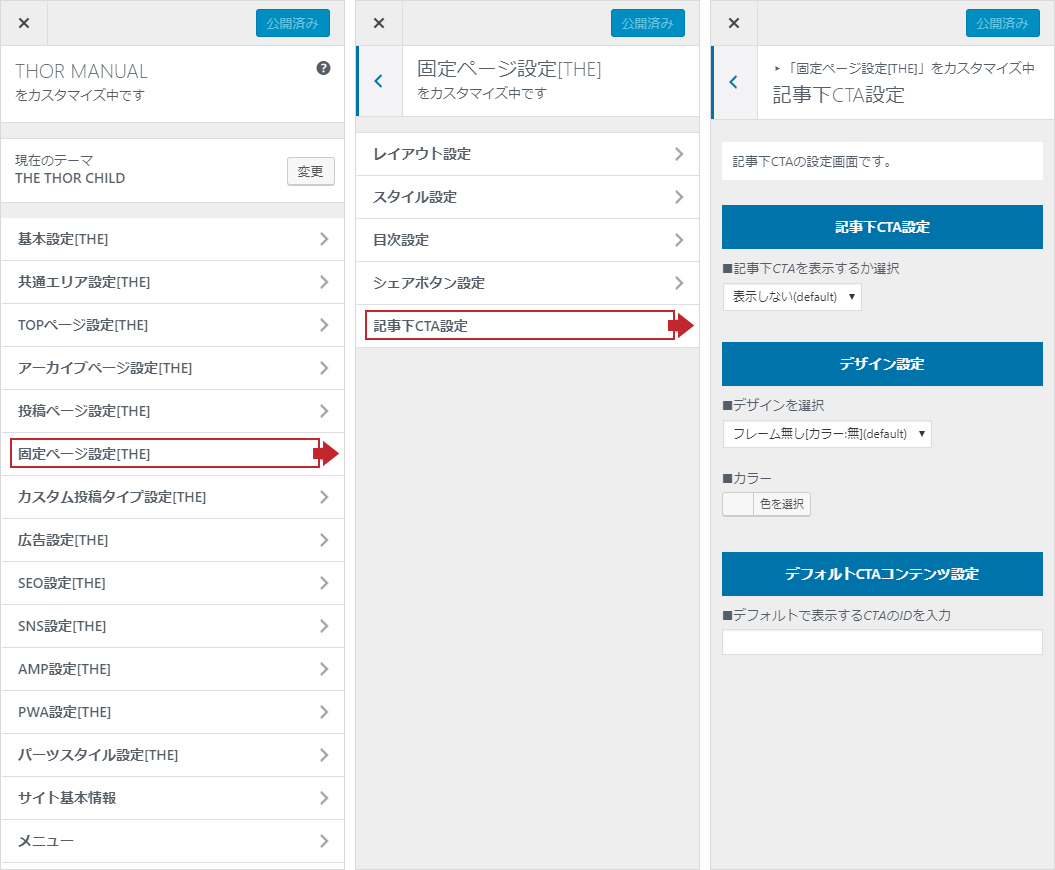 「表示する設定」に変更する場合は、「外観」→「カスタマイズ」→「固定ページ設定」→「記事下CTA設定」と進み、「記事下CTAを表示するか選択」で「表示する」を選択し「公開」を押してください。