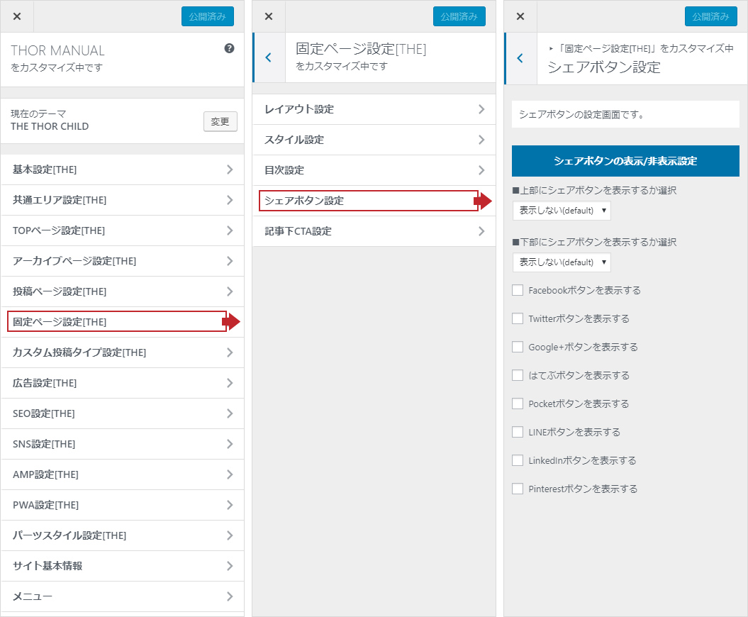 「外観」→「カスタマイズ」→「固定ページ設定」→「シェアボタン設定」と進み、「シェアボタンを表示するか選択」で「表示する」を選択します。