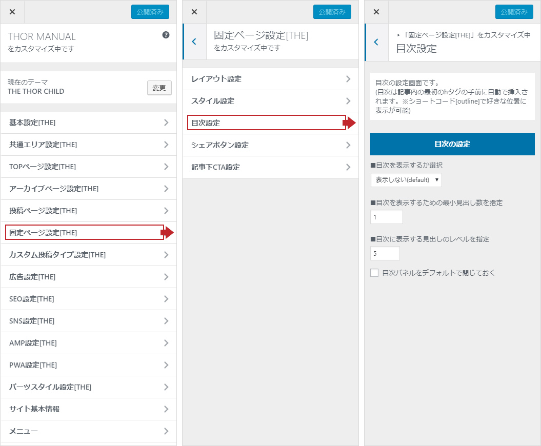 「外観」→「カスタマイズ」→「個別ページ設定」→「目次設定」へ進みます。