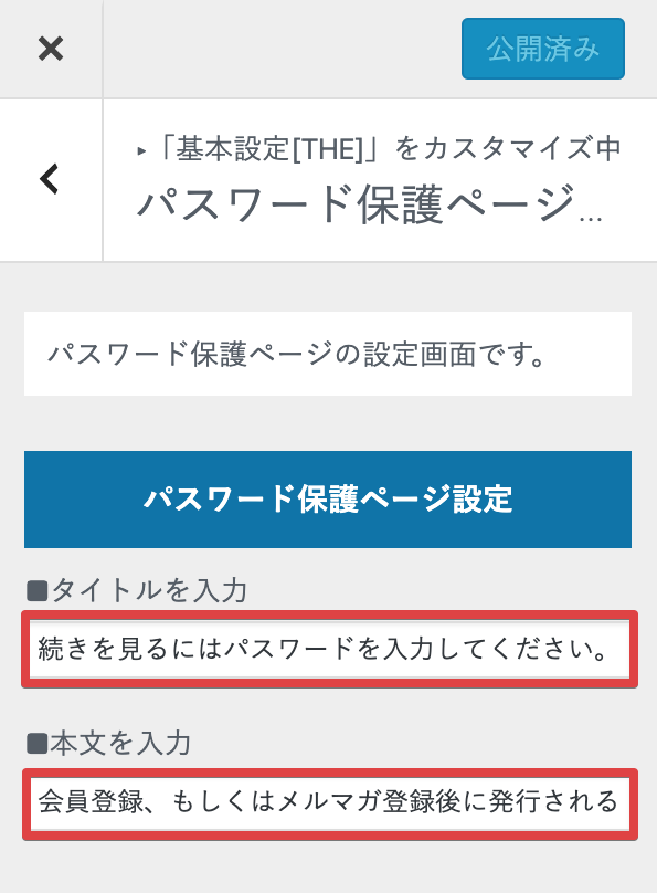 「パスワード保護ページ設定」からタイトルと本文を入力し「公開」を押してください。