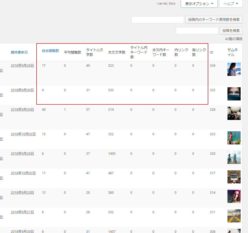 投稿一覧に先ほど検索したキーワードの「タイトル内キーワード数」「本文内キーワード数」が表示されます。