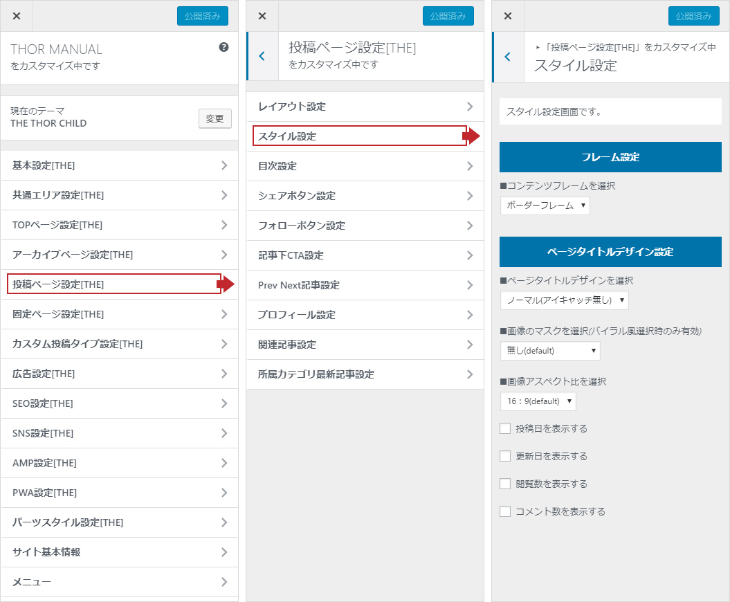 「外観」→「カスタマイズ」→「投稿ページ設定」→「スタイル設定」へ進みます。