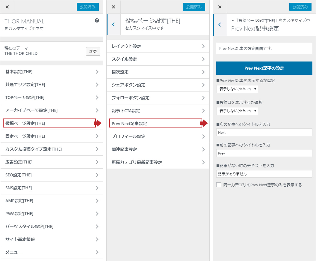 「外観」→「カスタマイズ」→「投稿ページ設定」→「Prev Next記事設定」へ進みます。