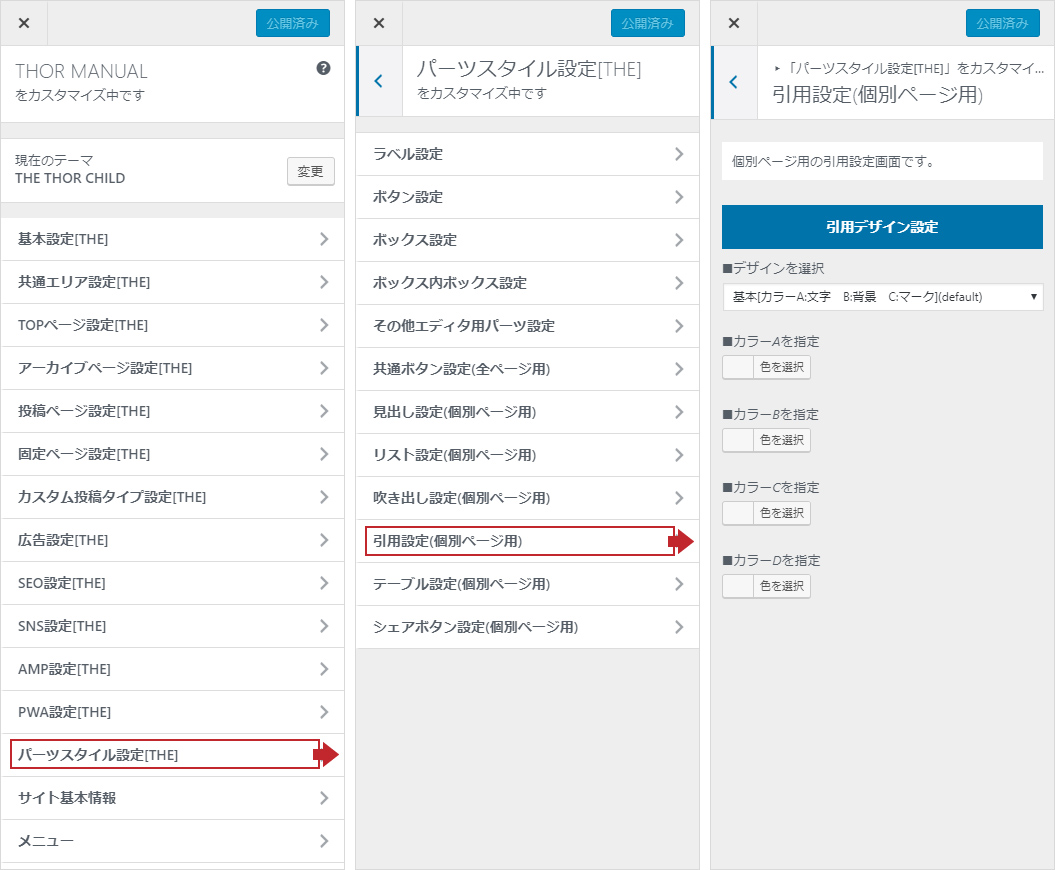 「外観」→「カスタマイズ」→「パーツスタイル設定」→「引用設定(個別ページ用)」へ進みます。