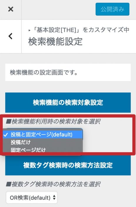 「検索機能利用時の検索対象を選択」のセレクトボックスを押すと、3つの検索対象が表示されます。