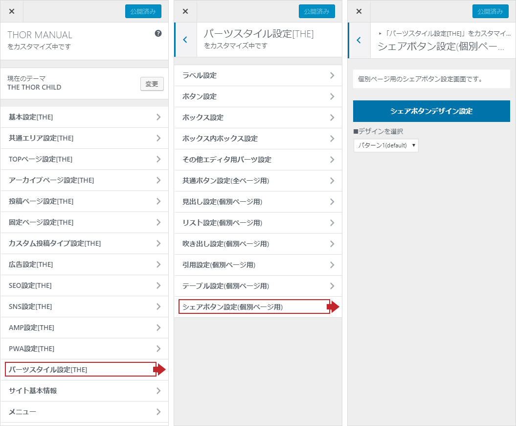 「外観」→「カスタマイズ」→「パーツスタイル設定」→「シェアボタン設定(個別ページ用)」へ進みます。