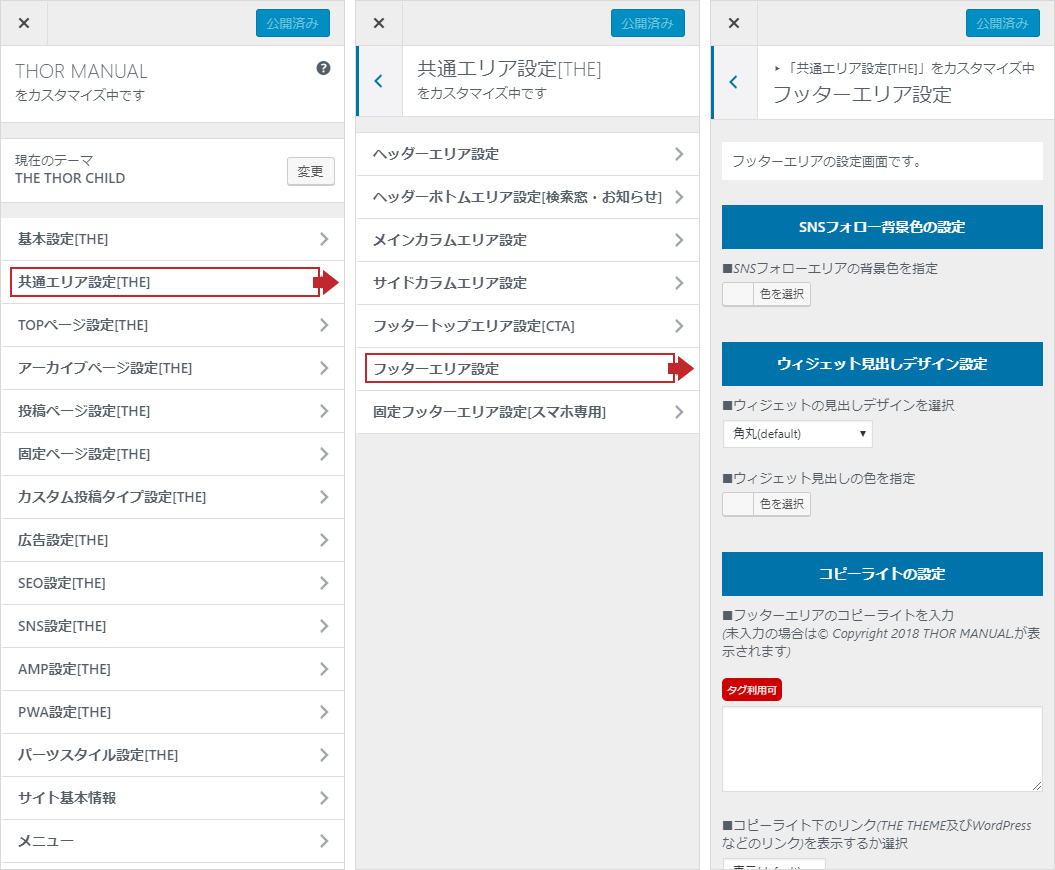 「外観」→「カスタマイズ」→「共通エリア設定」→「フッターエリア設定」へ進みます。