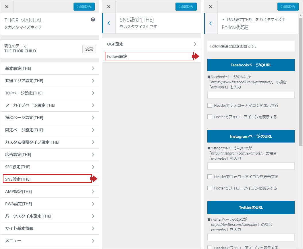 「外観」→「カスタマイズ」→「SNS設定」→「Follow設定 」へ進みます。