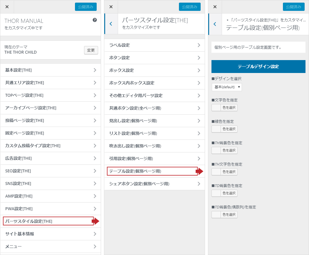 「外観」→「カスタマイズ」→「パーツスタイル設定」→「テーブル設定(個別ページ用)」へ進みます。