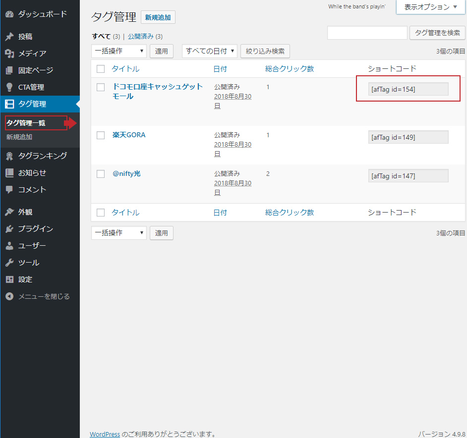 「タグ管理」の一覧から記事に貼り付けたいショートコードをコピーします。