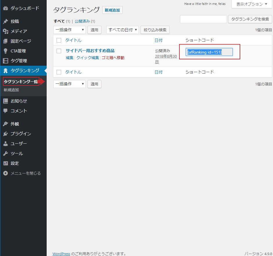 「タグランキング」の一覧から記事に貼り付けたいショートコードをコピーします。