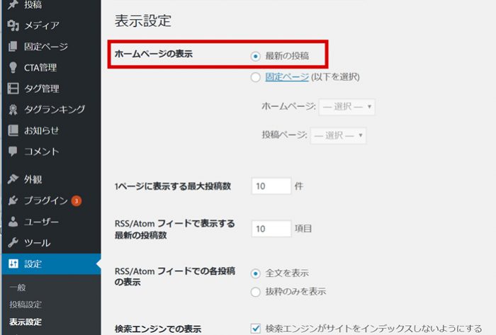 「設定」→「表示設定」で、「ホームページの表示」が最新の投稿になっている場合は、下記の手順となります。