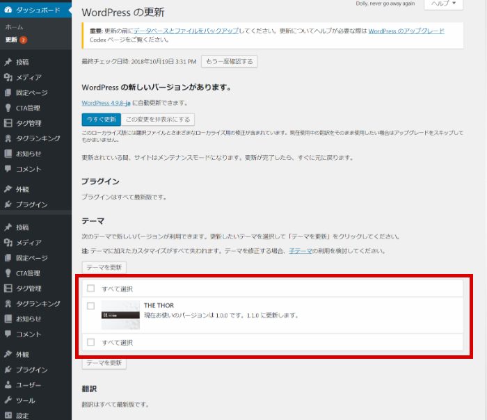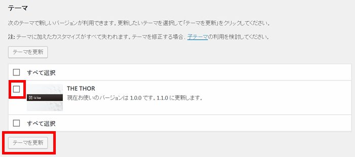 THE THORにチェックを入れて、「テーマを更新」をクリックするとバージョンアップが始まり、自動的に完了します。