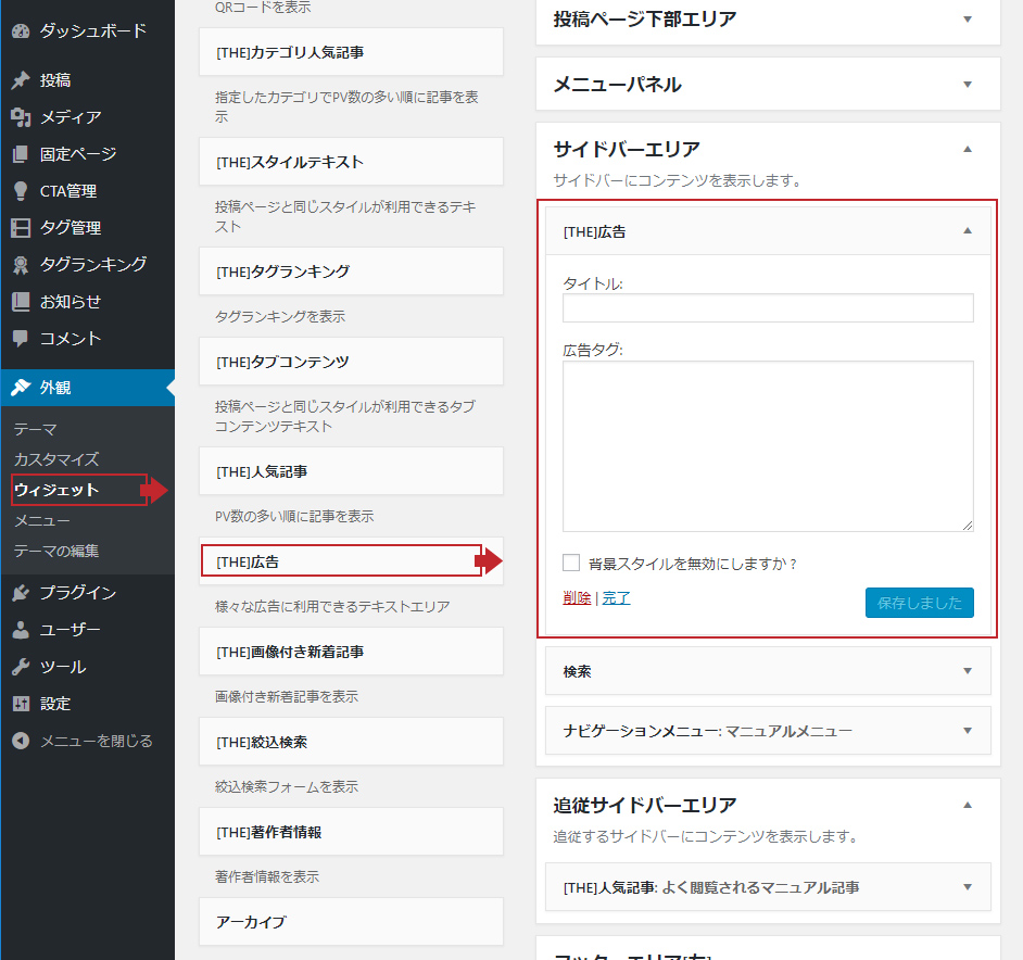 広告タグをウィジェットエリアに設置する方法