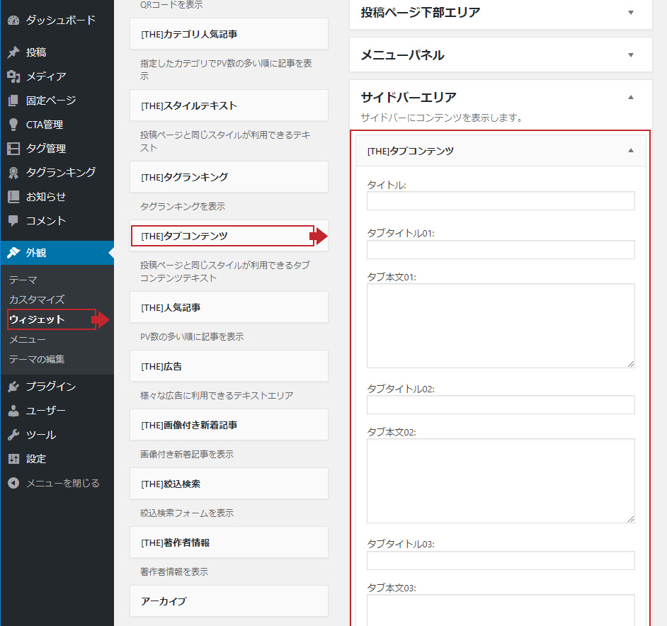 この記事では、タブコンテンツをウィジェットエリアに設置する方法をご紹介します。